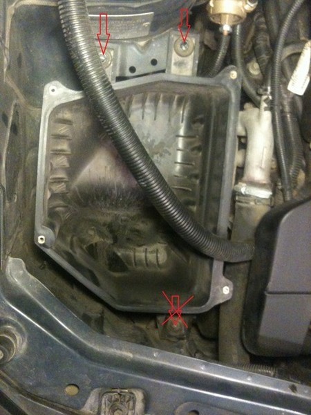 2. Вытаскиваем корпус воздушного фильтра — нужно открутить только два верхних винта, нижний (около фары) откручивать не нужно (я с дуру корячился) — он просто как направляющая в резинке стоит.