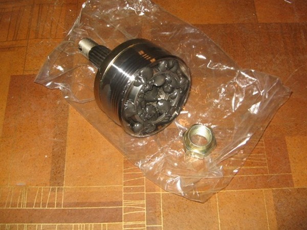 11. Одеваем ШРУС на шлицы, для этого, чтобы не повредить резьбу накручиваем на конец ШРУСа ступичную гайку, приставляем его к приводу, следя за тем чтобы шлицы совпали и ударами молотка, через деревянный брусок, насаживаем ШРУС до упорного кольца. Эту операцию тоже удобнее проводить вдвоём.