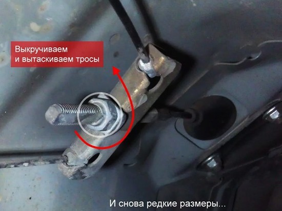 Максимально раскрутить, чтобы достать бобышки. Потом, когда вставили от новых тросиков гайкой натянуть ручник.