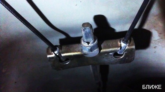 2. Опустите ручник максимально вниз и приступайте к подтяжке. Одной рукой необходимо удерживать кронштейн с тросами, а второй тянуть гайку по часовой стрелке, наблюдая при этом за свободным ходом наконечников.