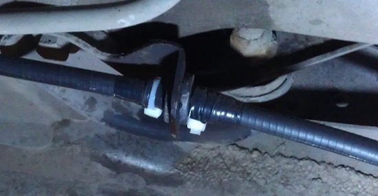 7. Убедитесь в том, что ручник не поднят вверх, затем стяните концы троса с одного кронштейна суппорта, а после и с другого.