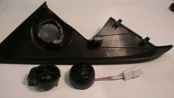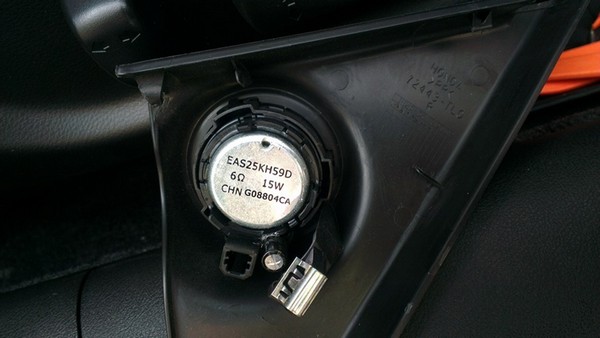 Как уже писал, первое, что беспокоило после покупки авто — треск из передних динамиков. Ими и решил заняться в первую очередь. Поддеваем и снимаем с защелок пластиковую накладку с твитером: