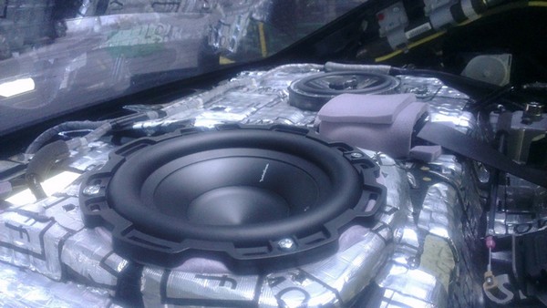 Что касается сабвуфера — какой бы динамик мы не поставили в штатное место, он все равно останется только басовой подзвучкой, но никак не полноценным сабом. Виной тому место установки — задняя полка. Полка сделана из тонкого металла, дребезжит и звенит. Сверху металлической полки находится огромная пластиковая декоративная полка, которая добавляет порцию призвуков. Звук от динамика уходит в никуда — частично растворяется в большом багажнике, частично тонет в дребезжании полки.
