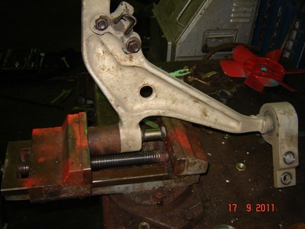 Вставляем монтировку между рычагом и суппортом и отжимаем вниз, при этом, в место, где идет на конус цапфа (фото 3) наставляем молоток и кувалдой бьем по молотку. Удар должен быть хорошим. У меня шаровая с первого удара выскочила.