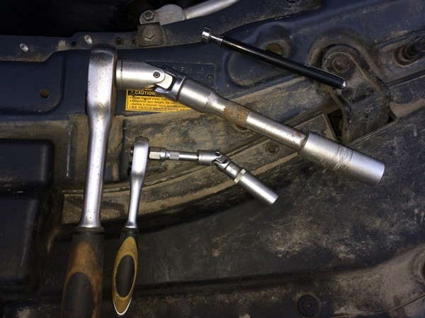 Для начала нужно найти необходимый инструмент. Я считаю, что мне это удалось. Но со свечной головки предварительно нужно удалить резинку, иначе с дальней свечкой у вас ничего не получится. для доставания свечей рекомендую использовать спец магнит (у меня в виде ручки).