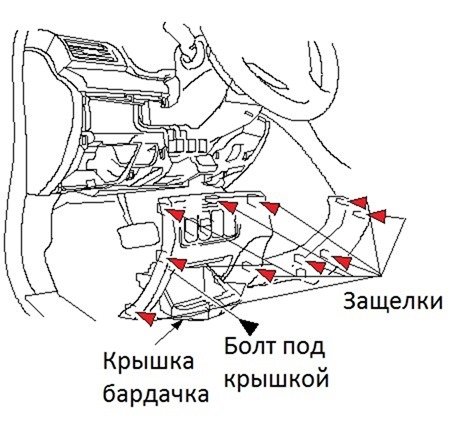 Далее необходимо снять часть консоли, которая идет непосредственно под рулем, на которой расположены кнопки парктроников, омывателей фар и кнопка отключения стабилизации и которая ограничивается сверху серыми, пластиковыми молднигами (молдинги снимать не нужно). Перед тем, как снимать эту крышку, необходимо ослабить рычаг изменения наклона и вылета руля и поднять руль максимально вверх. Затем открываем небольшой бардачок, который находится слева от руля под кнопками омывателя фар, парктроников и кнопки отключения стабилизации и выкручиваем там один единственный болтик. Он находится внутри слева на торце, поэтому его сразу заметно. А далее просто начинаем тянуть с нижних краев постепенно всю это консоль, пока не отщелкнутся все защелки. Схематичное расположение защелок и болта смотрим на рисунке ниже: