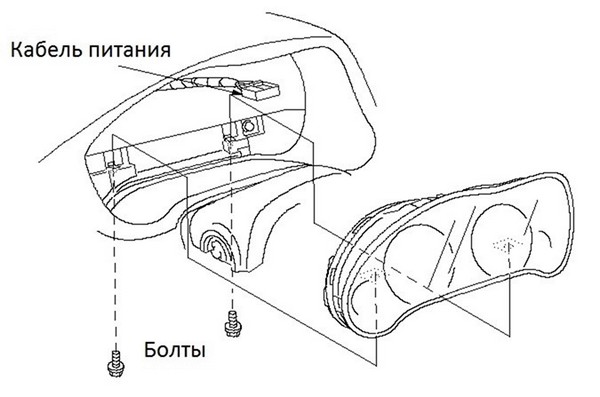 После этого остается самая малость — это выкрутить два болта под только что снятой крышкой нижней консоли, которые держат непосредственно уже панель приборов. Для этого понадобится крестовая отвертка или ключ на 8, но хочу заметить, что то, чем нужно крутить, должно быть достаточно длинным, т.к. подобраться к тем болтам не очень просто, поэтому желательно иметь длинную отвертку или торцовый ключ, с удлинителем. После того, как мы открутили эти два болта, можно начинать вытаскивать панель приборов и с этим уже трудностей не возникает. После того, как панель приборов будет вытащена, нужно отключить единственный провод питания от нее и вытащить ее полностью, чтобы было удобно менять само стекло. Схематической расположение болтов приборной панели представляют на рисунке ниже: