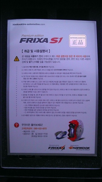 Внутри коробки помимо колодок находится красивый вкладыш на мелованной бумаге. То ли это гарантийный талон качества. то ли, просто реклама. Увы, корейского языка я не знаю.