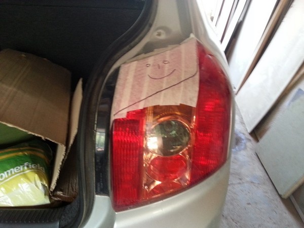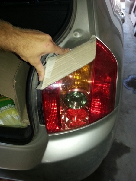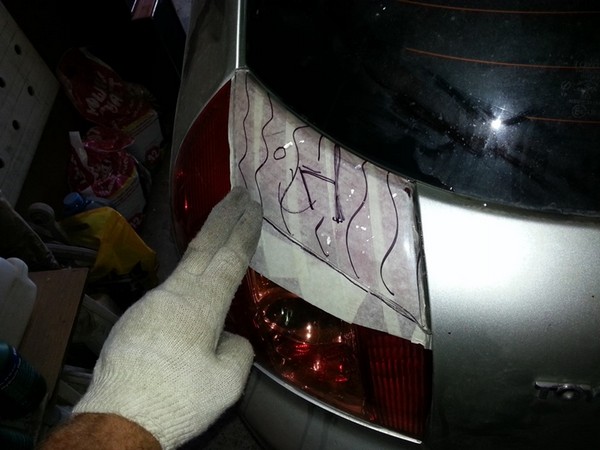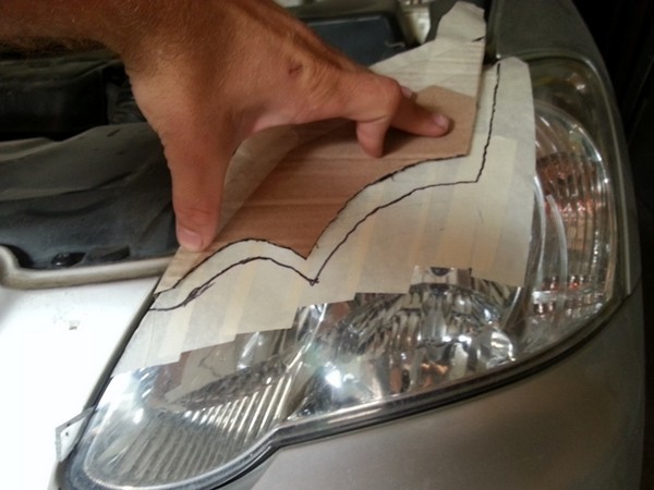 После обклеиваем рабочую поверхность фары малярным скотчем, прикладываем форму и обводим маркером, не убирая его сделайте отметки края фары внизу и вверху картонной формы, зеркально их нарисуйте на обратной стороне этого шаблона — форма для 2-й фары готова!