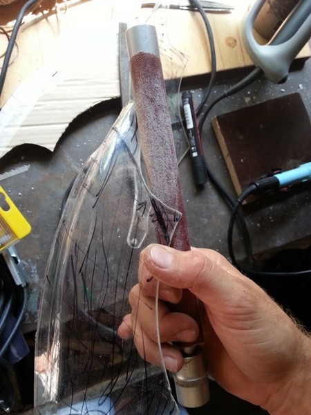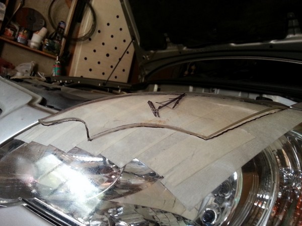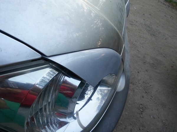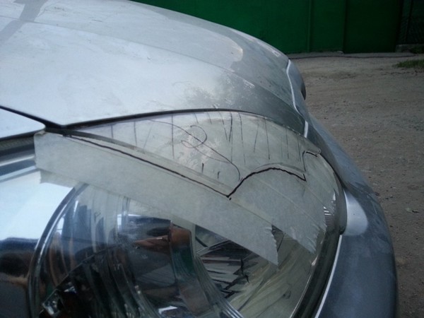 Достаем — кладем на доску, накрываем газетой и бегом к фаре (конечно же если вы их не хотите снимать, как я, например). Прикладываем по нарисованному контуру и тупо закрываем капот, и всесторонне его прижимаем по форме фары. После феном дорабатываем часть ресницы, которая находиться под капотом, прогревая оргстекло пока оно не размякнет, придаем форму и поливаем водой. Конечный результат Вас очень порадует.