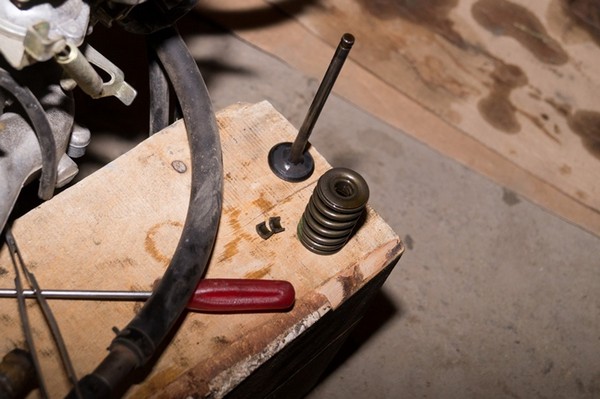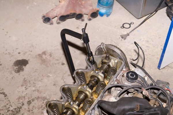 Впервые этим занимался, но хитрого нет ничего, если есть инструмент и "голова" снята с мотора. Подбираем оправку нужного размера, упираем рассухариватель одним концом в клапан со стороны камеры сгорания, другим со стороны пружины и сжимаем. Сухари высвобождаются и выпадают сами.