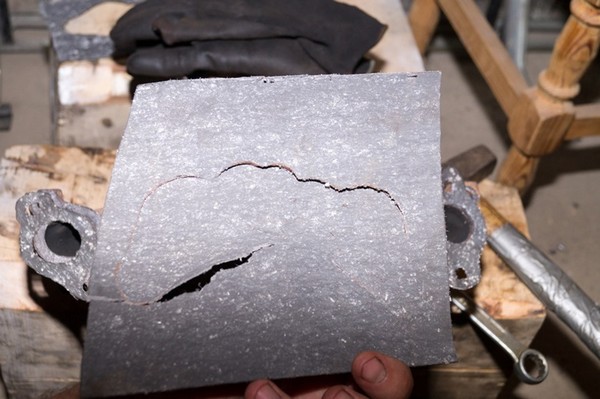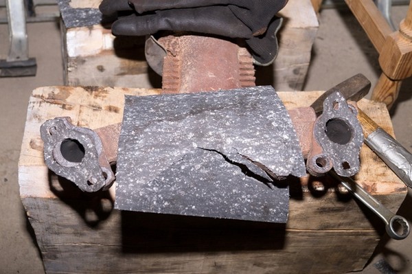 Когда планировал ремонт, как-то упустил из виду, что понадобятся прокладки под коллектор. Пришлось вспомнить дедовский метод и обстукивая молоточком по кромке, вырубить новые прокладки из листа паронита.