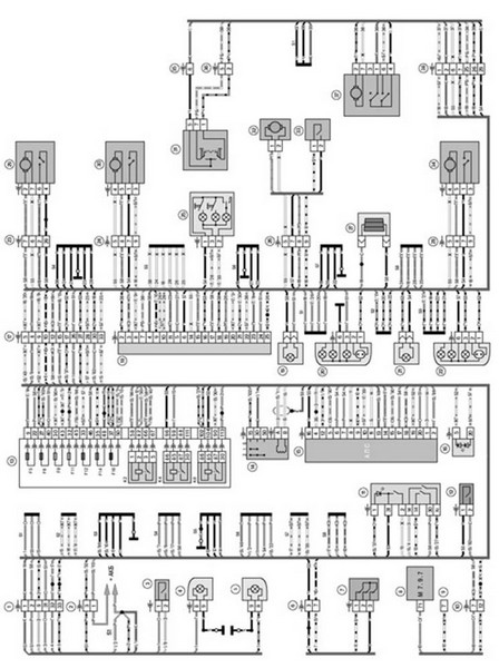 17 – контакты 33-клемных колодок жгута панели приборов и жгута заднего;