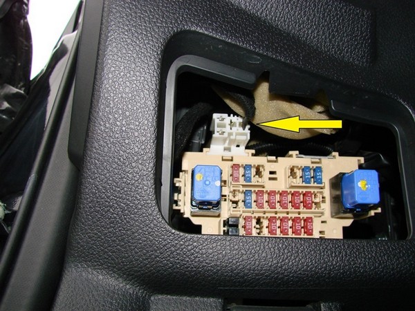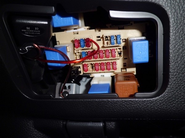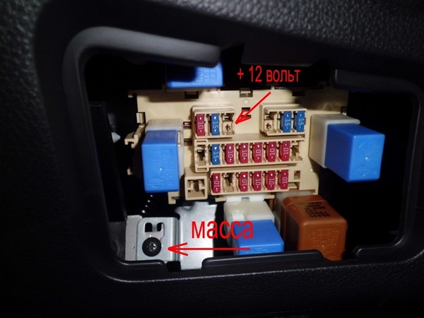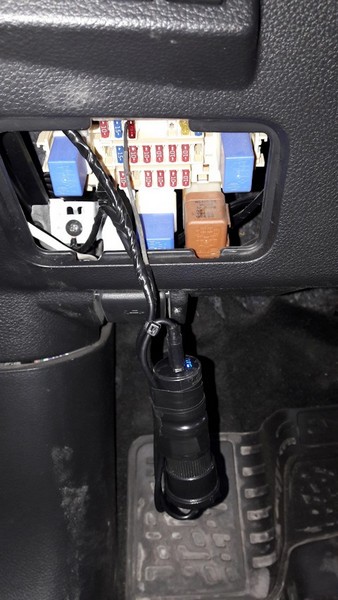 Изначально задумано что запись на регистраторе включается автоматически при включении зажигания, это если он подключен в прикуриватель. Меня такой вариант не прельщает, хочу, чтобы регистратор писал и во время стоянки… например на парковке около магазина — всякое бывает, хоть только перед, но под контролем). Хотим — делаем! Постоянный плюс был найден в подрулевом блоке предохранителей, в незанятой ничем колодке.