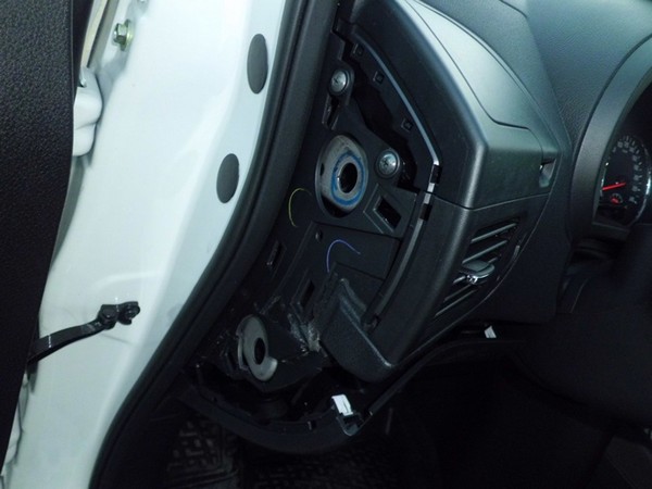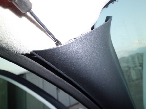 Берем плоскую отвертку, засовываем ее под пластиковую обшивку левой стойки крыши и тихонечко, контролируя усилия, тянем на себя и отщелкиваем пластик стойки.