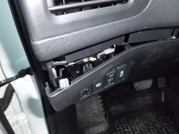 Отщелкиваем нижнюю крышку торпеды, на которой находятся кнопки корректора фар, люстры, и ЕСП (поддеваем ее отверткой и тянем на себя пальцами)