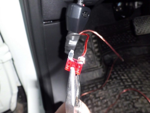 Вставляем предохранитель в гнездышко целой ножкой вниз. Отрицательный проводок (минус, масса) засовываем под саморез