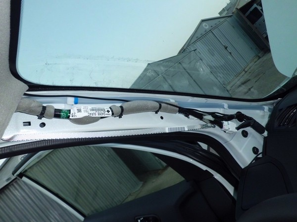 Протягиваем кабель питания регистратора по левой стойке вверх (прихватываем изолентой к шлейфу со штатной проводкой), далее прячем под обшивку крыши, тянем к зеркалу