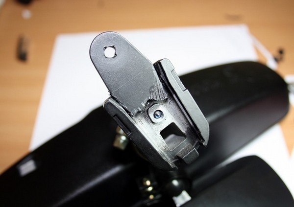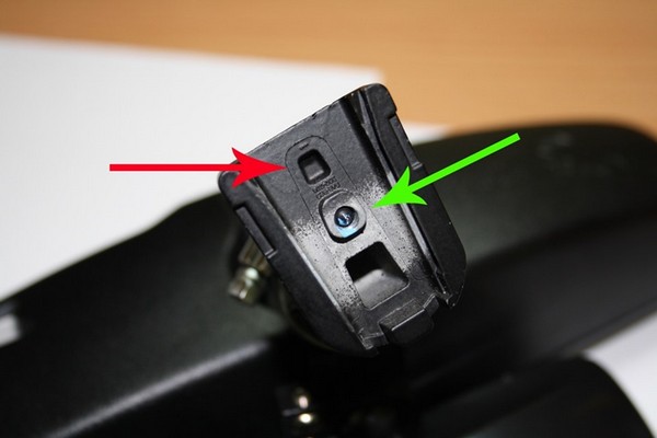Вот что мы увидим с другой стороны крепления зеркала. Зеленая стрелка — тот самый болтик. Красная стрелка — ямочка (углубление) которая нам еще очень пригодится.