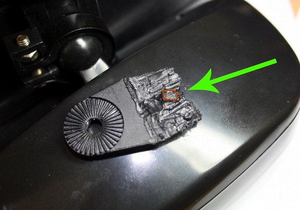 Нога немного толще чем само место куда я ее пытался втулить и поэтому паяльничком я снял немного пластика. Зеленой стрелкой обозначен пупырышек (выступ) на пластике, который необходимо оставить. Он то и будет фиксировать крепление в той самой ямочке (углублении) о которой я писал выше!