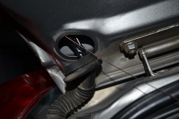 Видим чёрный жгут с проводами, рядом с ним (с помощью проволоки) протягиваем провода.