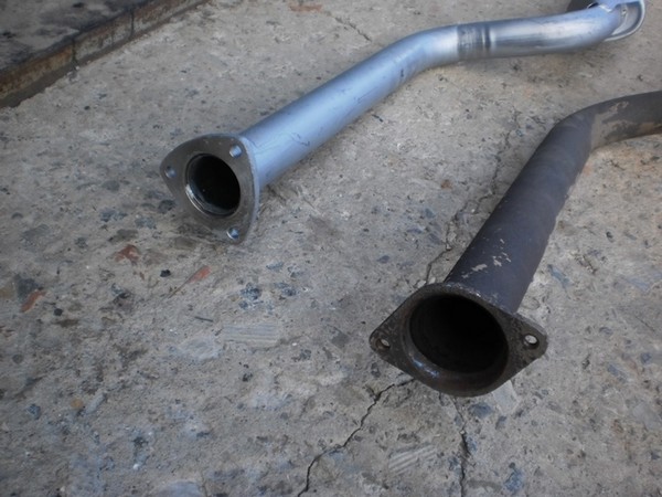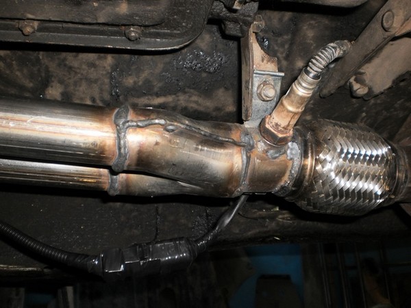 Тут вылезла проблемка — старая выпускная труба и резонатор были "старого образца", на два крепежного отверстия, новая же выпускная труба была под новую крепежку — без металлографитового кольца и болтов с пружинами и на три крепежных отверстия. Резонатор был куплен "нового образца", под три крепежных отверстия и второй датчик кислорода, который был благополучно заглушен обрезанным болтом + сварка.