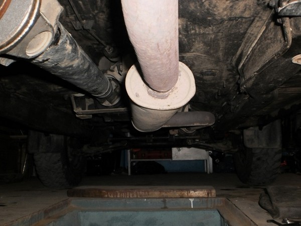 Резонатор был надорван потому, что он весит слишком низко и преодолеваемые препятствия бьют в самый его край, отрывая от трубы (см. картинку выше). Видимо, не у одного меня резонатор надрывался в этом самом месте, поэтому конструкторы и решили его усилить — резонатор "нового образца" усилен трапециями от края резонатора к трубе… сверху. Не знаю, каким местом думал "конструктор", который "изобрел" сие, но он явно не отрывал свои конструкторские булки от своего конструкторского кресла и не ездил по реальному бездорожью, кроме как ровной грунтовки вокруг автосалона. Было принято логичное решение — отрезать трапеции сверху и приварить их снизу — это будет не только усилением, но и своеобразной лыжей, которая будет исключать прямой удар препятствия в резонатор.