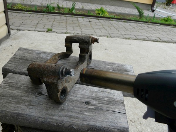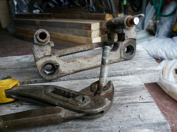 Скоба правого суппорта — с которой боролся на прошлой неделе. Остаток пальца удалось раскачать и вытащить с наваренной гайкой. Проверяйте подвижность суппорта раз в год, дабы избежать манипуляций с горелкой, болгаркой и т.д.