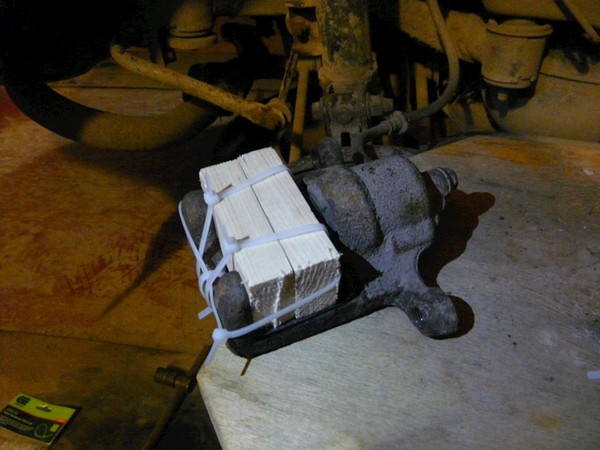 Т.к. скоба еще не до конца освобождена, а ездить нужно — суппорт будет временно подвешен на авто. Поршень зафиксирован брусками. До разборки суппорт практически не работал. Т.е. сейчас при использовании машины в поездках ничего не изменится.