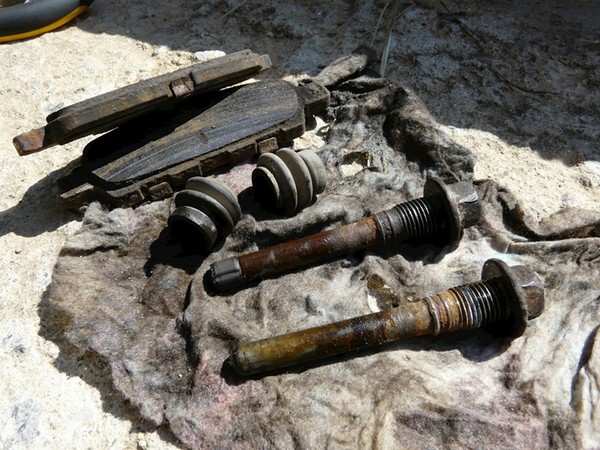 Новые пальцы на правый суппорт. Родные удалось вытащить только при помощи болгарки, горелки и сварки. Палец с проточкой под резинку — нижний.