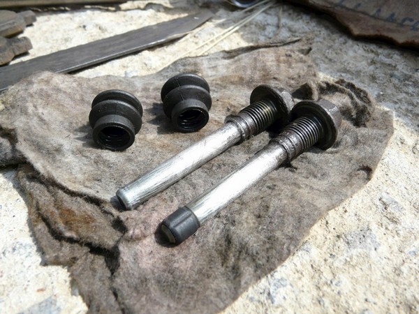 Пальцы левого суппорта после чистки. Люфта нет. После смазки и установки они благополучно выкрутились через год, т.е. при вчерашней замене тормозов.