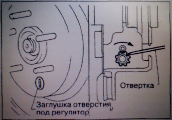 Вот таким образом регулируется положение колодок. Поворачивая диск совмещаем положения регулятора (внизу) и резиновой заглушки. Через освободившееся окошко плоской отвёрткой имеем возможность развести или свести колодки снизу. Работает так (при опущенном ручнике): разводим колодки регулятором до неподвижности диска; далее сводим колодки до момента свободного вращения диска. Далее, при необходимости, регулируем трос ручника из салона до 5-7щелчков.