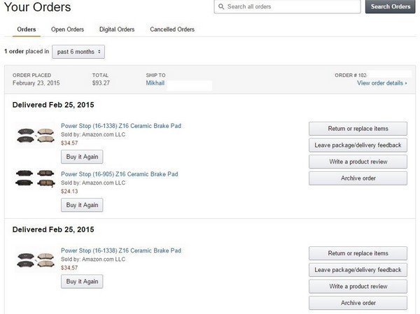 Захожу на сайт Amazon, вбиваю 16-1338(передние колодки) и затем вбиваем 16-905 (задние колодки), и что я вижу (фото уже заказа):