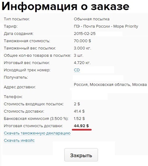 Общая стоимость доставки у меня вышла 44,92 USD, с карты списали 2829,96 руб.
