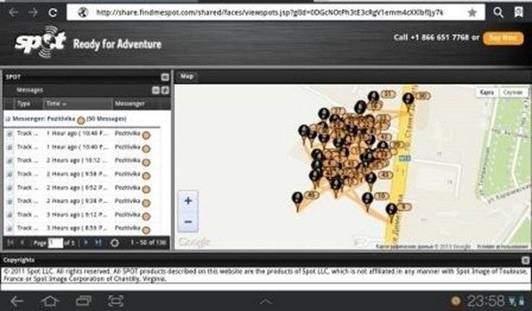 Точки трека будут храниться на карте неделю, а потом исчезнут. Чтобы сохранить трек на бесконечное время, нужно зарегистрироваться на странице SPOT Adventures и привязать к ней свой SPOT. Я пока с этим не разбирался, но на первый взгляд там все так же просто, как и активизация SPOT. На SPOT Adventures можно не только сохранять свои треки, но и снабжать их описаниями и фотографиями. Удобно.