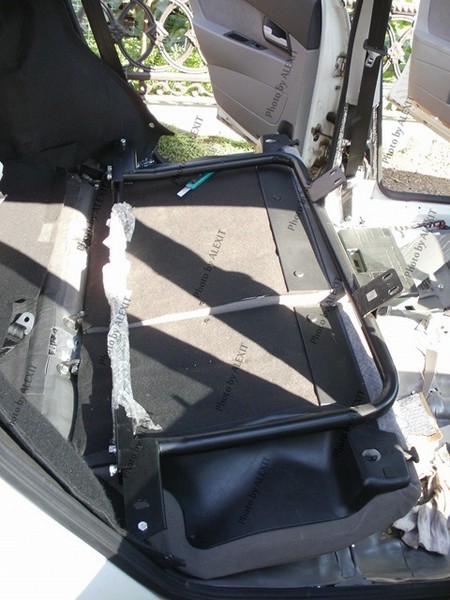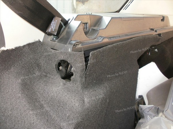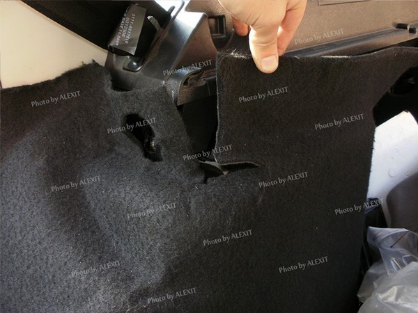 С задним же усилителем отдельная история. Совсем другая. Пришлось откручивать не по одному разу обшивку багажника (без снятия боковых частей полки, их только ослабить), снимать спинки сидений с ремнями и даже открутить сами ремни снизу арок. После примерной подгонки и сверления дополнительных маленьких отверстий в кронштейнах боковин задней полки усилитель все-таки встал на место. Только спинки сидений все равно не защелкнулись. Пришлось еще пару раз снимать и допиливать напильником регулировочные отверстия под защелки замков спинок, пока наконец, не удалось настроить замки. Но все равно закрываются чуть хуже, чем на стоке. При финишной установке подрезал задние обшивки по месту и прикрутил их на место к боковинам. Провозился примерно часа 2.