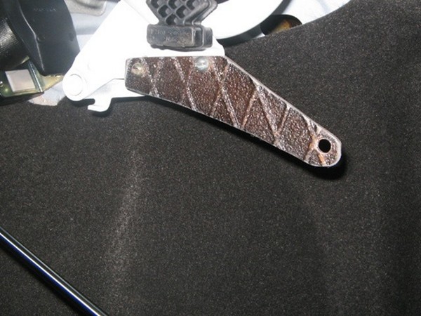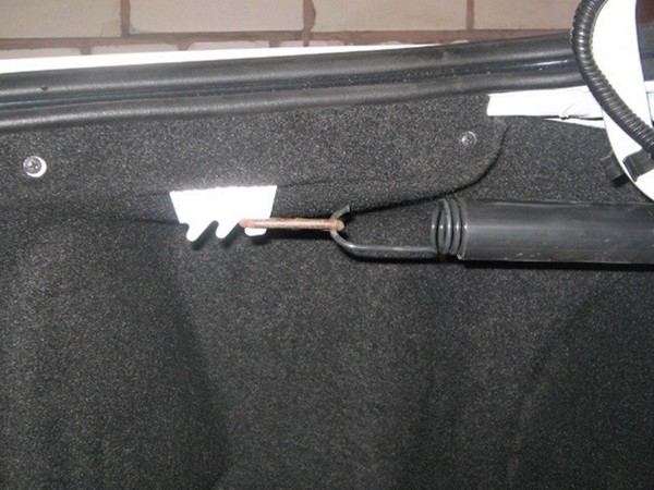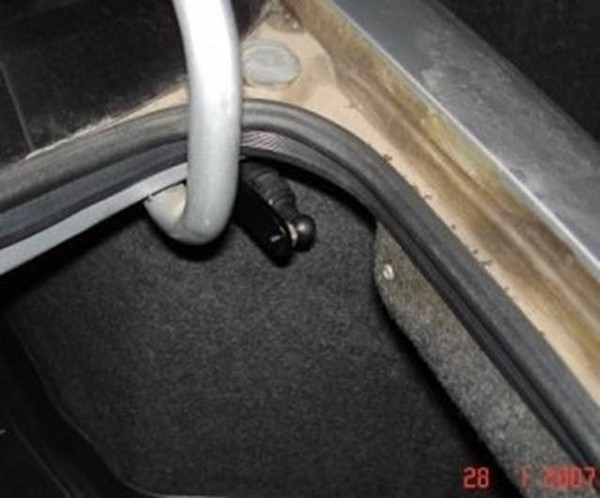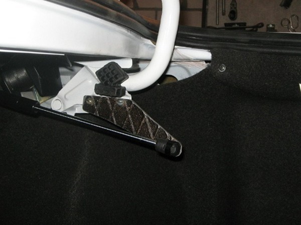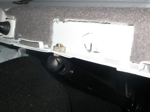 Прикручиваем упор в салоне за откинутым сиденьем (делаем отверстие на 8 мм). У меня в районе крепления ушка штатной полки (фото 2). Обратите внимание! Может мешать магнит динамика у полок с другим расположением акустики.