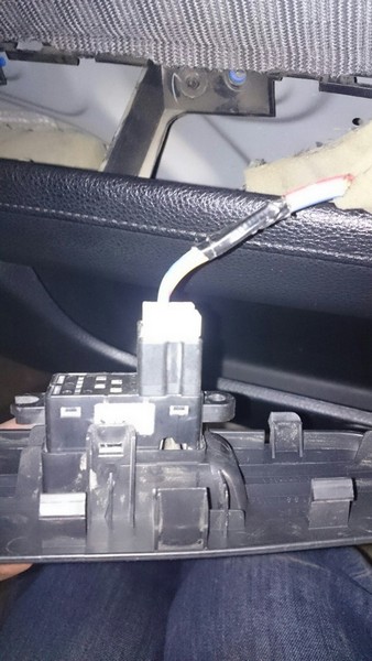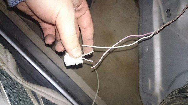 На задних дверях находим спрятанную косичку из 2 проводов с фишкой и отрезаем ее, т.к. я не видел смысла колхозить провода динамиков в фишку.