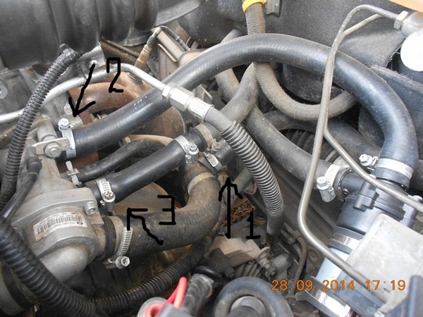 Патрубок отопителя обратный (номер 3 на схеме) с помощью муфты и куска шланга одеваем на термостат. А патрубок расширительного бачка (номер 1 на схеме) на трубу малого круга.