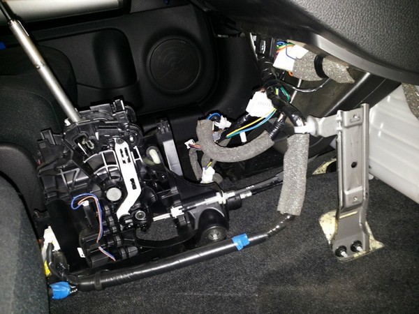 Чтобы снять ручку КПП, сдвигаем на ней пластиковую втулку вниз и вытаскиваем стопорную скобу. После этого ручку просто тянем наверх.