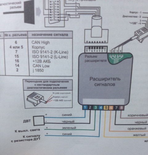 В сам комп врубается провод, идущий от расширителя сигналов, в который уже подключается шина и штекер OBDII.