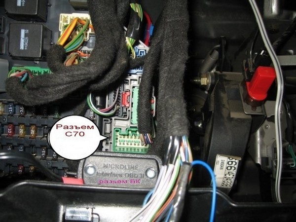Дальше я сделал так, я зачистил синий провод на шине и воткнул его в углубление на вилке С70 в гнездо бело-красного провода, затем я эту вилку воткнул уже в разъем С70 вместе с проводом шины. Все, шина подключена и на синий провод подается сигнал с провода датчика ДУТ.