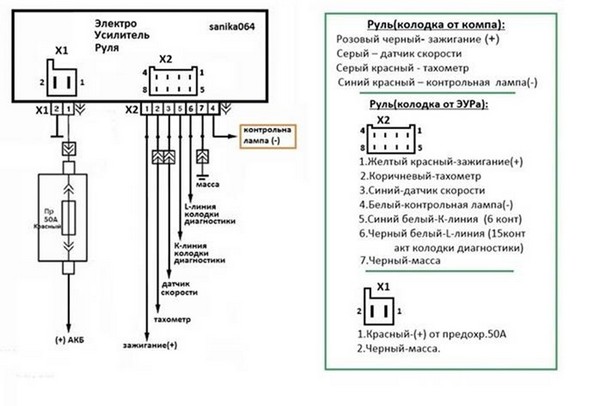Установка простая: снимаем рулевую колонку, карданчик, и проставку. Проставка нужна для рулевой колонки без ЭУРа. Можно ставить ЭУР и новый карданчик. Для других моделей ВАЗ нужна переходная пластина насколько мне известно. Но думаю, ее не сложно сделать, если есть материал. В блоке ЭУР два разъема. Первый - с толстыми «плюс» и «минус». Второй - на датчики и диагностику. «Плюс» идет прямо на аккум, минус - можно на аккум, а можно на массу (кузов).