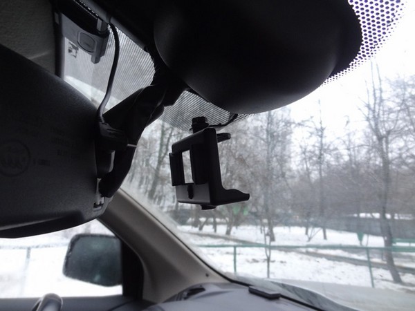 А вот с присоской возникли проблемы. Дело в том, что на шелкографию возле зеркала она присасываться наотрез отказалась, а крепить присоску ниже не хотелось, так как в этом случае регистратор висит практически посередине лобового стекла и сильно мешает обзору.
