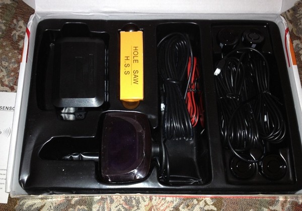 В комплекте сам парктроник, дисплей с зумером, 4 сенсора и фреза для врезки сенсоров в бампер. Я специально выбирал парктроник с прямоугольными разъемами сенсоров (бывают с круглыми) такими же, как и у GF-801, чтобы просто поменять коробочки, но не менять сенсоры в бампере.