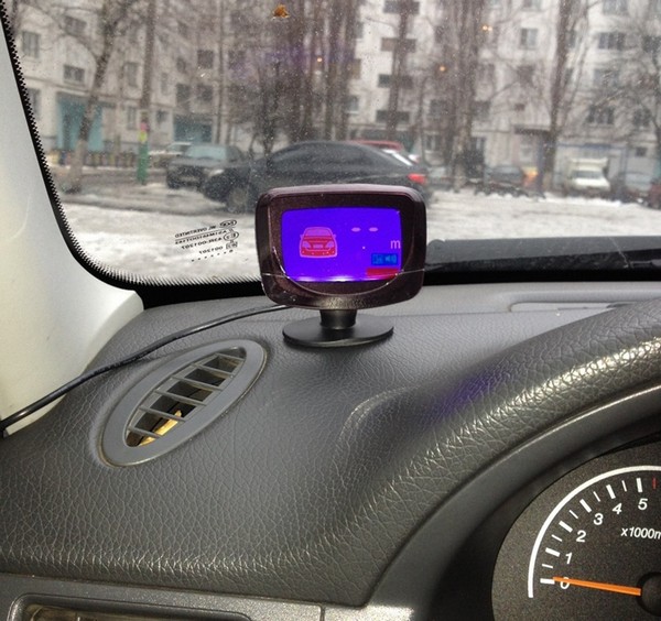 После проверил работоспособность парктроника включением зажигания и задней скорости, все заработало. Протянул провод дисплея под порогом к торпеде и установил экран на двухсторонний скотч, который шел в комплекте.