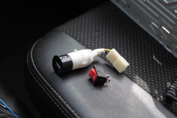 USB переходник в прикуриватель. На клеммы переходника напаяны провода и все замотано изолентой.
