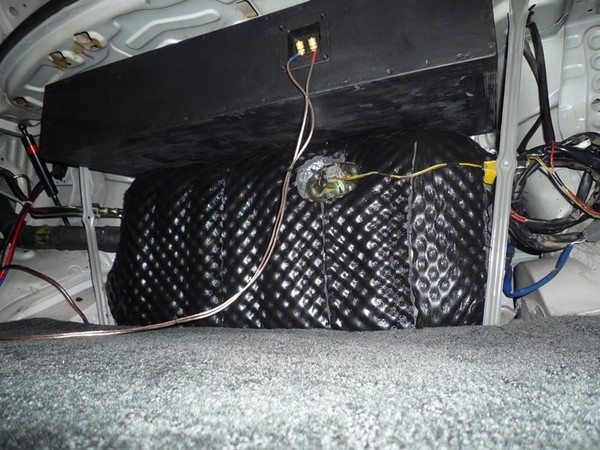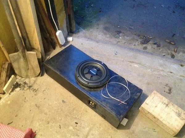 На фото видно не полный результат, но заменены все 4 проводка. Усилок подогнал другой друг, он от активного саба Mistery на 120W. Был сделан простенький деревянный корпус для усилителя, обклеен карпетом и прикручен к корпусу саба.