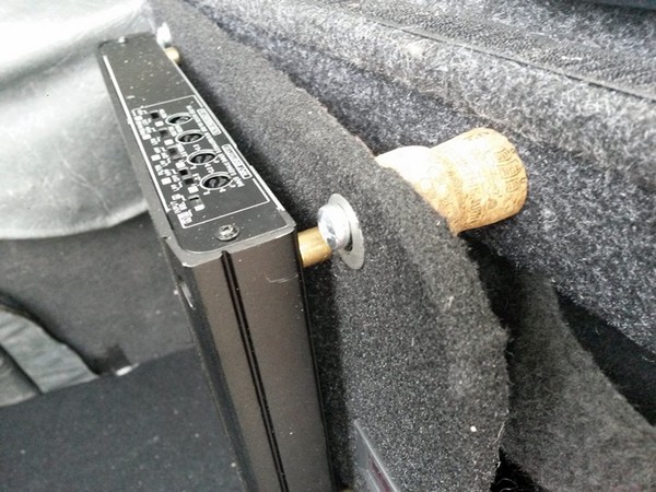 Полка благо заменена на деревянную, закреплена намертво — сверху крепимся к ней с помощью винтов на м6 в забивные гайки в полке. Сразу о критике на этом этапе — полка идет с расширением к двери багажника — не перпендикулярна бамперу, это неприемлемо для меня, так что пришлось использовать проставку для того чтобы стена стояла под углом 90 градусов к багажному проему. Бабуля посоветовала пробку от шапманского, я с радостью принял ее предложение, почему не покрасил — мне по кайфу как она выглядит, в каком-то смысле, пробка является еще и виброгасителем.