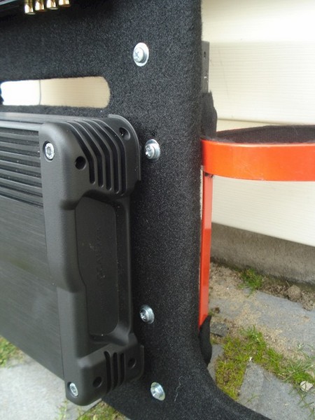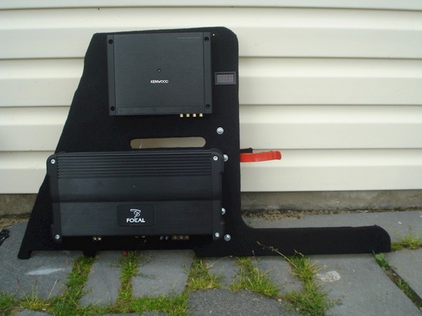 Долго думал, как закрепить усилители в авто. Система поканальная + саб. Много читал бортовые журналы, кто к спинкам сидений крепит это извиняюсь колхоз, кто фальшпол делает, этот вариант мне не нравился тем, что красоты не будет. Нужно чтоб и играло, и смотрелось. Предлагаю к вниманию такой вариант: первым делом напилил фанерину, по образу багажника, чтобы вошли оба усилителя. Сразу продумал отверстия для их охлаждения, подключения, крепления, подключения проводки, под вольтметр, крепление огнетушителя.